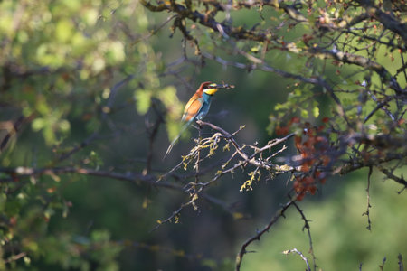 Colorful european bee eater bird perched on a branch with an insect in its beak
