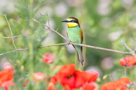 Bee-eater (Merops apiaster) on a branch with flowers