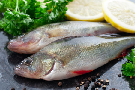Freshly caught perch with spices and ingredients.