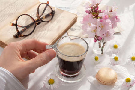 Black coffee in a cup held in the hand, next to a book with spring flowers on the table