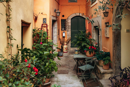 Roquebrune Cap Martin, France - February 9, 2025: Colorful old houses and traditional courtyard in the historic village of Roquebrune Cap Martin