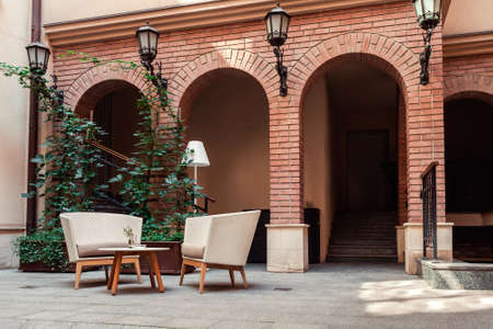 A place to relax with armchairs made ​​of straw and torchere in the yard against the background of brick arches