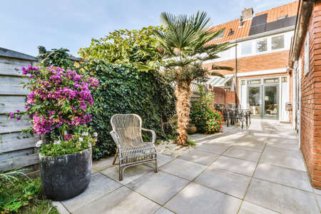 an outside area with some plants and pots on the ground in front of a row of bricked houses