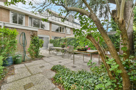 The backyard of the house is strewn with greenery and flowers. Vacation spot for the whole family