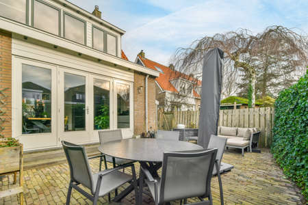 Outdoor patio with table and chairs, 3d rendering. Computer digital drawing.