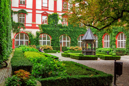 Wroclaw / Poland - August 19, 2017: View of the Ossolineum - the largest scientific library in Poland - courtyard with beautiful garden, arbor, arcade windows, and building walls with overgrown ivy plant.