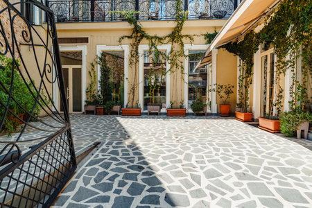 Beautiful courtyard with mosaic stone floor and potted plants in an urban setting during daytime