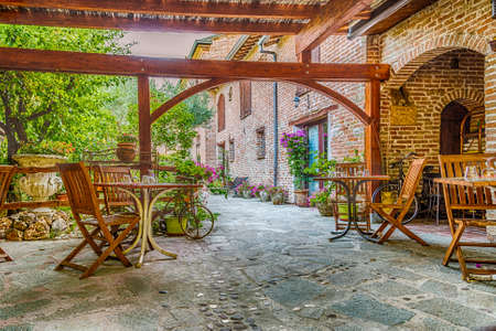 Italian outdoor country restaurant,wooden chairs and tables set with silverware, napkins and cups in a patio of masonry arches.