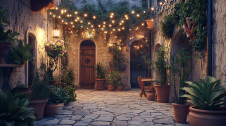 Outdoor dining area with string lights and rustic architecture in a cozy courtyard on a sunny day