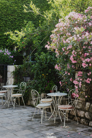 Empty pretty cafe by the sea in Przno near Budva, Montenegro. Travel destination in Montenegro.