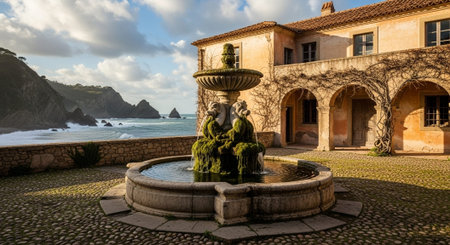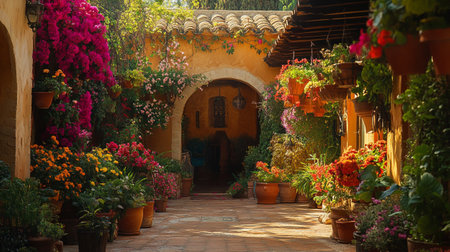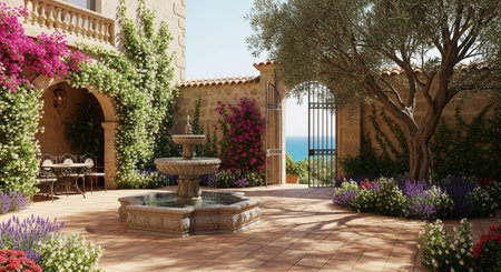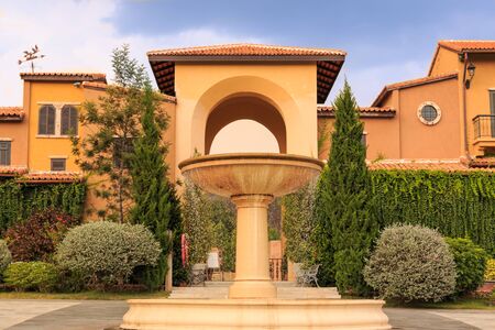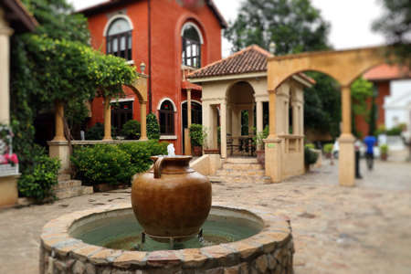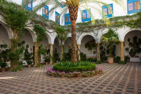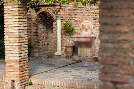 Courtyard with beautiful fountain, plants and arches with spanish atmosphere.