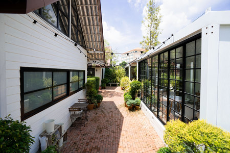 Restaurant cafe table with chair and umbrella in large building elegant at primo piazza,khao yai