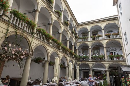 Lviv, Ukraine - August 13, 2019: Italian courtyard in the center of Lviv, medieval architecture.