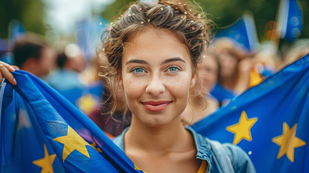 Closeup portrait of happy young caucasian female holding european union flag in national government euro campaign