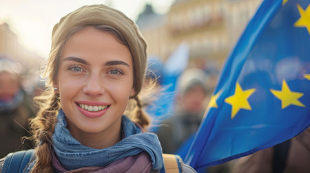 Close-up portrait of young woman smiling and waving blue european union flag with yellow stars for parliament elections vote