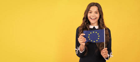 amazed kid hold european union flag yellow background, european union. Horizontal poster of isolated child face, banner header, copy space.
