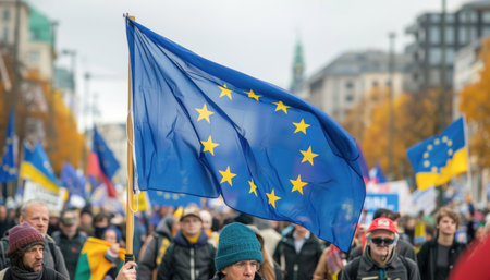 Portrait of happy attractive woman holding european union flag for campaign from behind with blurred crowd in background