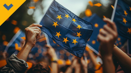Large group of people passionately holding European Union flags in a bustling city setting, highlighting unity, solidarity, and community spirit.