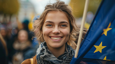 Close-up portrait of young woman smiling and holding european union flag with yellow stars for parliament elections with blurred people after voting