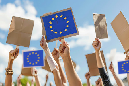 People are gesturing with signs featuring the EU flag against a cloudy sky