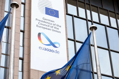 BRUSSELS, Belgium - July 1st, 2020: European flags blowing in front of the seat of the Council of the European Union, with the new banner of german rotating presidency