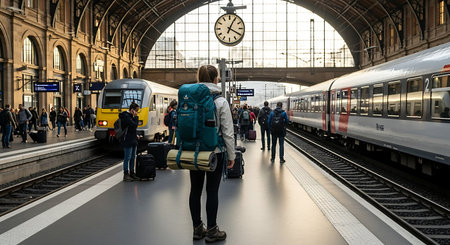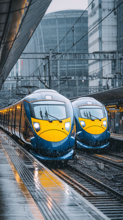 Detailed shot of a railway station with high-speed trains arriving and departing, and commuters waiting