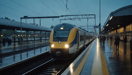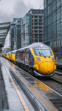 A modern train approaches a busy urban station on a rainy day. The platform glistens in the damp while tall glass buildings rise in the background.