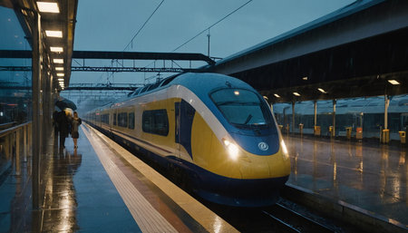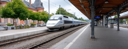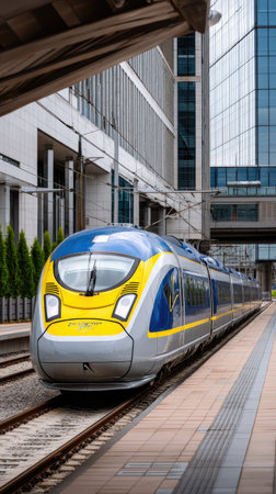 The railway station is traversed by a blue, fast train, Generative AI