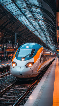 A sleek high-speed train waits at a vibrant train station filled with travelers. The station features a stunning architectural design with bright lights and spacious platforms.