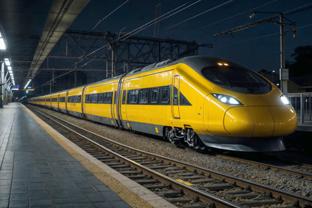 High-speed yellow train is on the tracks at a train station at night. The train is long and has many windows