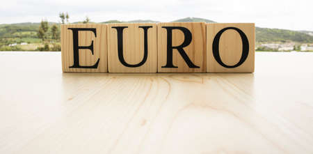 The word euro from wooden cubes. Cloudy sky and mountains in the background. Close up