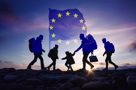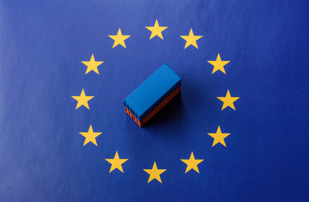 Multiple EU flags in front of a glass facade, symbolizing European solidarity and collective strength. Generative AI