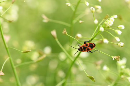 Firebug on yellow flower. Insects wildlife. Spring blossom