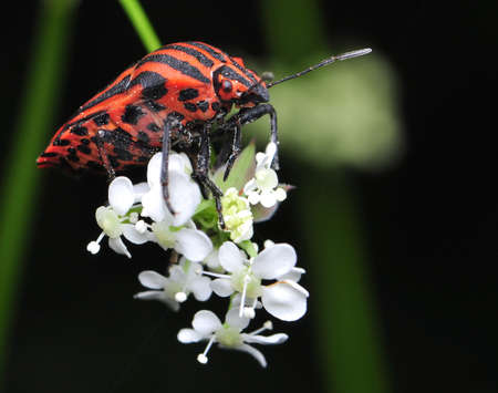 striped beetle Graphosoma lineatum in dill flowers close-up