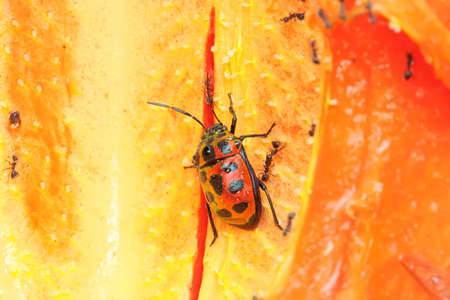 Bugs with orange body and black dots in macro. . Bug like ladybug on lens