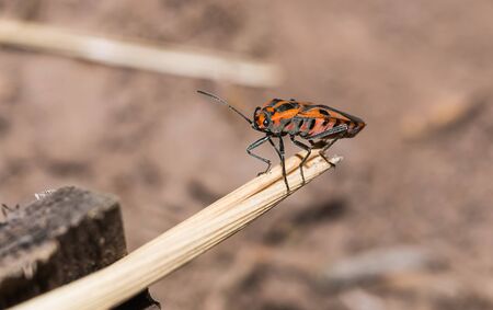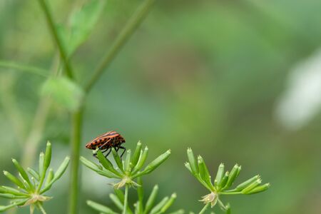 Red striped bedbug on a green branch of dill Graphosoma italicum, red and black striped stink bug, Pentatomidae. High quality photo