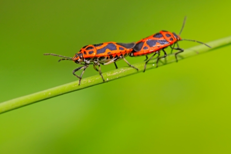 Mating of the firebug, Pyrrhocoris apterus on the leaf. High resolution photo.