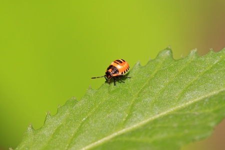 stinkbug on the green leaf, closeup of photo
