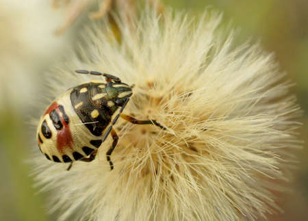 Red vegetable patterned bug on white dandelion