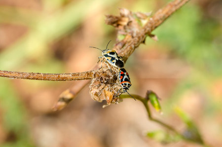 A selective focus shot of two Eurydema ornatas on a branch