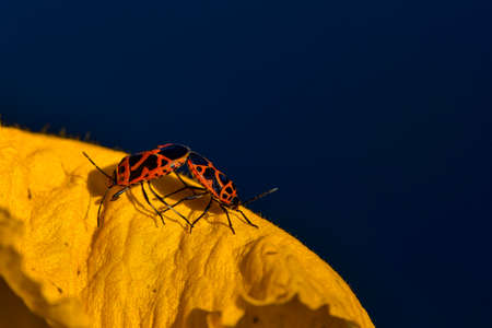 Close up of the mating of a vegetable bug perched on a pumpkin flower