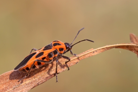 Beautiful orange-black bug with white dots sits on the ginger decorative spikelets on blurred floral background. Latin name - Corizus hyoscyami