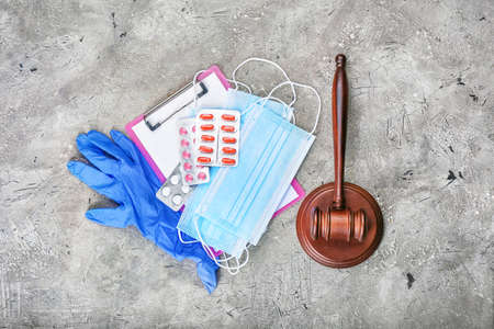 Judge gavel, pills, gloves and masks on gray background. Concept of health care reform