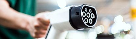 Electric car charging detail. Green and renewable energy technology. Horizontal
