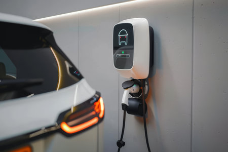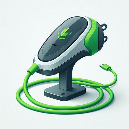 An electric vehicle charger is plugged into the charging port, symbolizing the shift towards clean and green energy. The focus on sustainable technology and eco-friendly practices