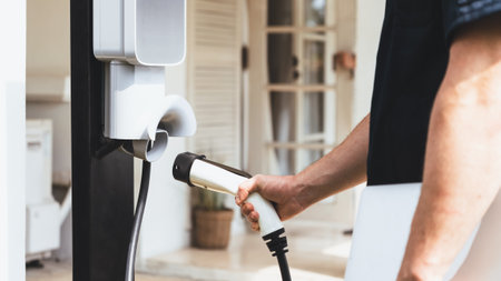 Cropped image of ev owner taking plug from public charging station