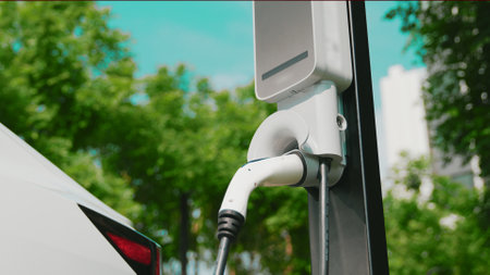 EV electric car charging in green sustainable city outdoor garden in summer. Urban sustainability clean rechargeable energy lifestyle of electric vehicle recharging battery at green city park innards