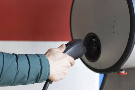 Male hand holds cable for charging an a electric car