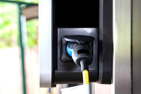 Shallow depth of field (selective focus) image with an electric car charging cable and plug at a charging station.
