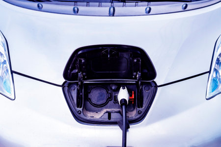 Close up image of the power socket of an electric car, charging.